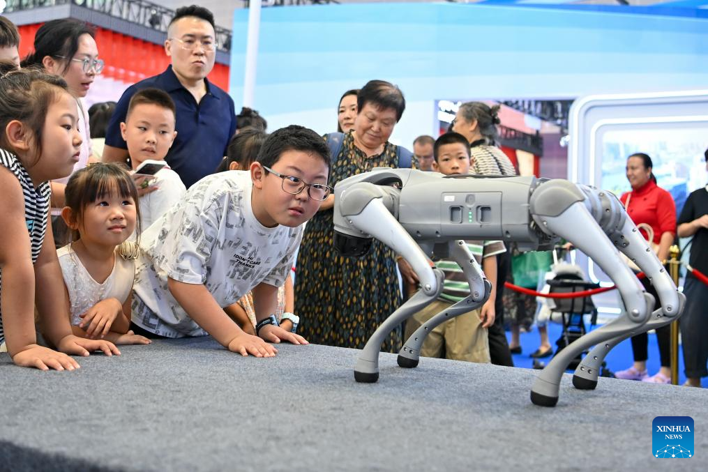 TAIYUAN, 21 agosto, 2025 (Xinhua) -- Niños interactúan con un perro robot en la 7ª Feria de Industrias Culturales de Shanxi, en Taiyuan, en la provincia de Shanxi, en el norte de China, el 21 de agosto de 2025. La feria comenzó aquí el jueves y durará hasta el 25 de agosto, atrayendo a aproximadamente 2.000 expositores de más de 30 países y regiones de todo el mundo. (Xinhua/Yang Chenguang)