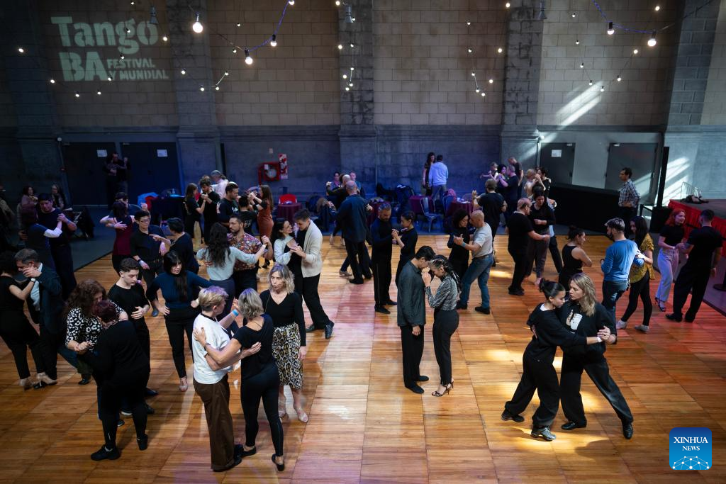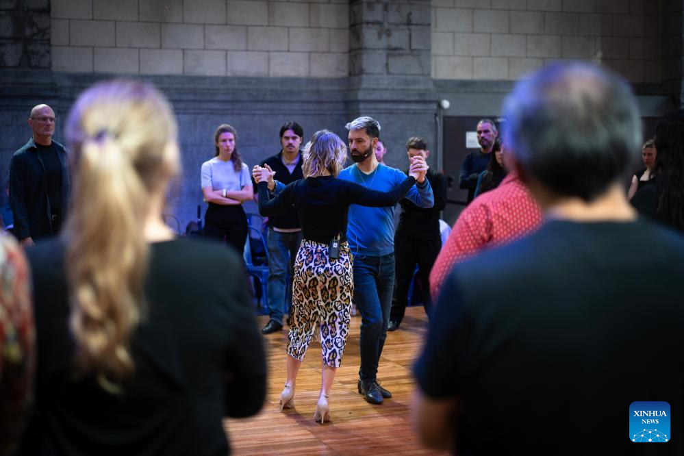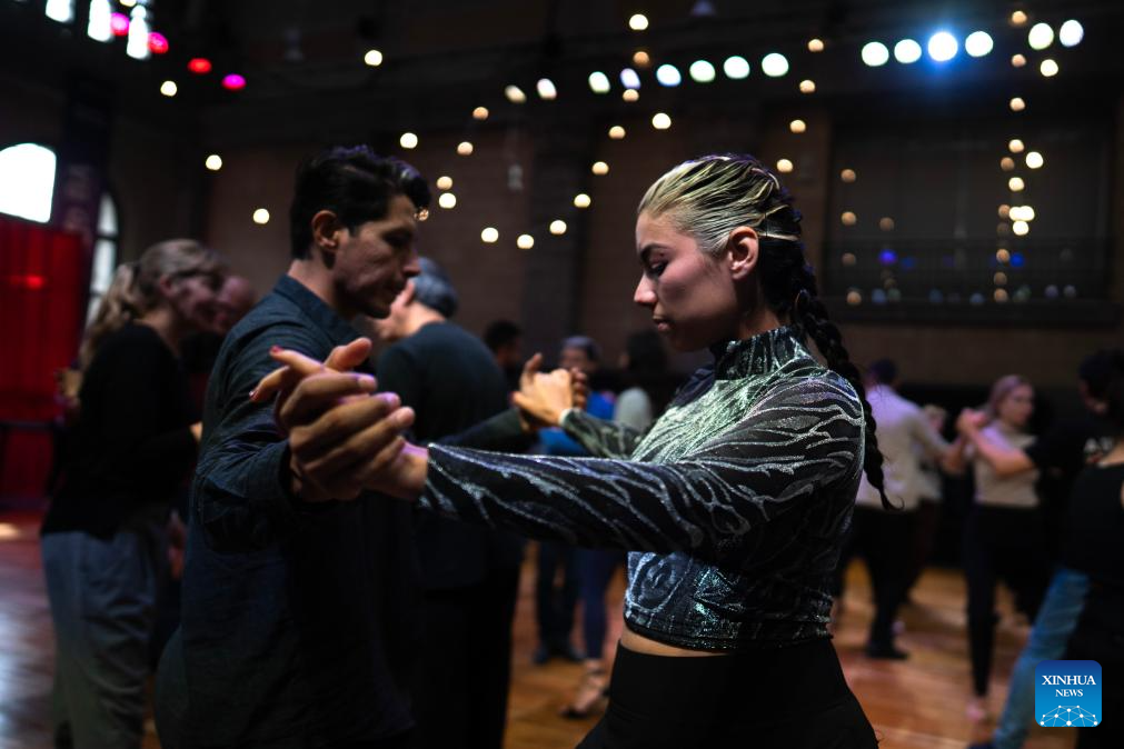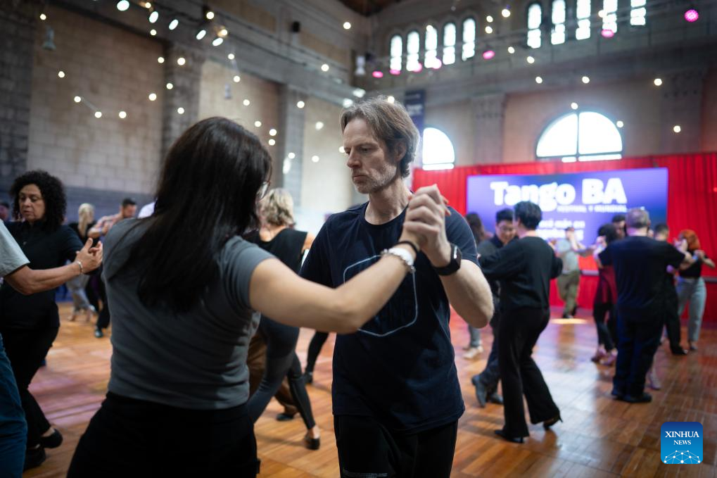 BUENOS AIRES, 21 agosto, 2025 (Xinhua) -- Imagen del 20 de agosto de 2025 de personas participando en una clase de tango impartida por los bailarines, Javier Rodríguez y Vanina Bilous, durante la jornada inaugural del Festival y Mundial de Tango 2025, en el Auditorio de la Usina del Arte, en la ciudad de Buenos Aires, capital de Argentina. La capital de Argentina, Buenos Aires, comenzó a vibrar desde el miércoles con una nueva edición del Festival y Mundial de Tango 2025, actividad que tuvo su puntapié formal con actuaciones históricas de orquestas de tango, clases y exhibiciones en distintos escenarios. (Xinhua/Martín Zabala)