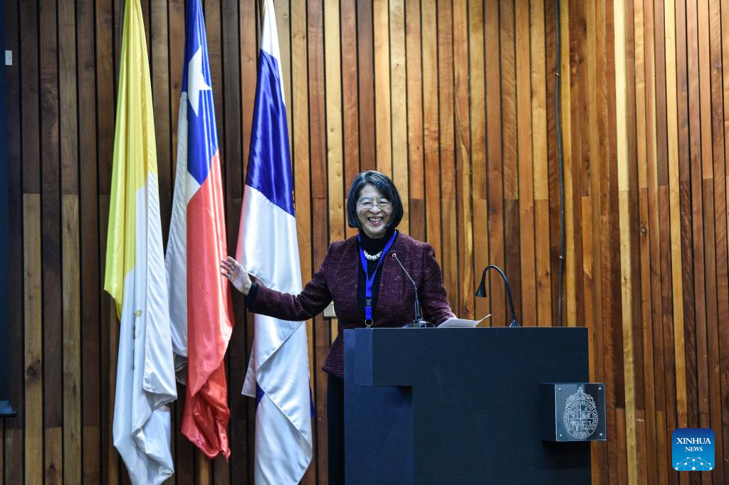 SANTIAGO, 23 agosto, 2025 (Xinhua) -- Imagen del 22 de agosto de 2025 de la directora del Centro Latinoamericano de la Universidad Tsinghua, Chen Taotao, pronunciando un discurso durante la final del concurso "Desafío de juventud China - LAC para aliviar pobreza 2025" llevada a cabo en la Pontificia Universidad Católica de Chile, en Santiago, capital de Chile. Estudiantes universitarios latinoamericanos y chinos se reunieron esta semana en Chile en una competencia de proyectos innovadores para enfrentar el desafío de la pobreza multidimensional en esta región, en el marco de un programa de intercambio entre jóvenes encabezado por universidades de ambas partes. (Xinhua/Jorge Villegas)