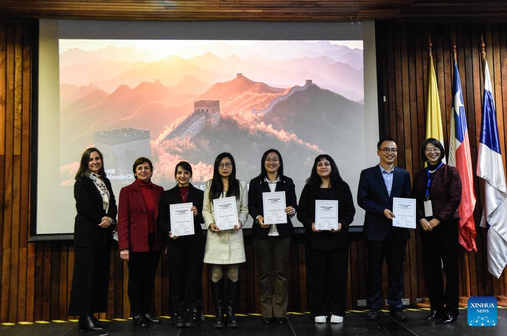 SANTIAGO, 23 agosto, 2025 (Xinhua) -- Imagen del 22 de agosto de 2025 de estudiantes creadores del proyecto "Fuente de Sueños Resplandecientes" posando para una fotografía tras ganar la final del concurso "Desafío de juventud China - LAC para aliviar pobreza 2025" llevada a cabo en la Pontificia Universidad Católica de Chile, en Santiago, capital de Chile. Estudiantes universitarios latinoamericanos y chinos se reunieron esta semana en Chile en una competencia de proyectos innovadores para enfrentar el desafío de la pobreza multidimensional en esta región, en el marco de un programa de intercambio entre jóvenes encabezado por universidades de ambas partes. (Xinhua/Jorge Villegas)