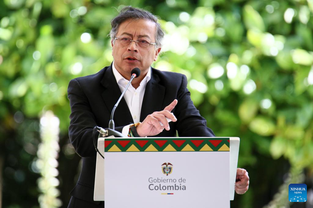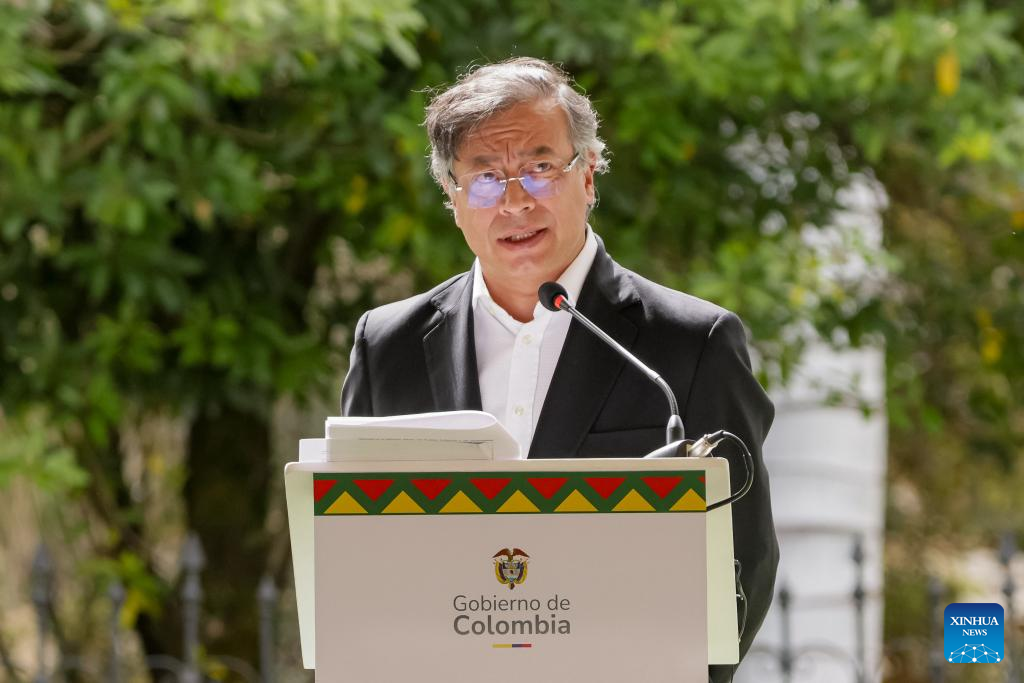BOGOTA, 22 agosto, 2025 (Xinhua) -- Imagen cedida por COLPRENSA del presidente colombiano, Gustavo Petro, hablando en una declaración conjunta en el marco de la cumbre presidencial de la Organización del Tratado de Cooperación Amazónica (OTCA), en Bogotá, capital de Colombia, el 22 de de agosto de 2025. Los presidentes de Brasil, Luiz Inácio Lula da Silva, y de Colombia, Gustavo Petro, anunciaron medidas conjuntas para hacer frente al narcotráfico y otras economías ilegales que amenazan la región amazónica, en el marco de la cumbre presidencial de la OTCA que se celebró el viernes en Bogotá, la capital colombiana. (Xinhua/Lina Gasca/COLPRENSA)