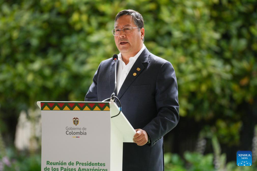 BOGOTA, 22 agosto, 2025 (Xinhua) -- Imagen proveída por la Presidencia de Colombia del presidente boliviano, Luis Arce, hablando en una declaración conjunta en el marco de la cumbre presidencial de la Organización del Tratado de Cooperación Amazónica (OTCA), en Bogotá, capital de Colombia, el 22 de agosto de 2025. Los presidentes de Brasil, Luiz Inácio Lula da Silva, y de Colombia, Gustavo Petro, anunciaron medidas conjuntas para hacer frente al narcotráfico y otras economías ilegales que amenazan la región amazónica, en el marco de la cumbre presidencial de la OTCA que se celebró el viernes en Bogotá, la capital colombiana. (Xinhua/Presidencia de Colombia)
