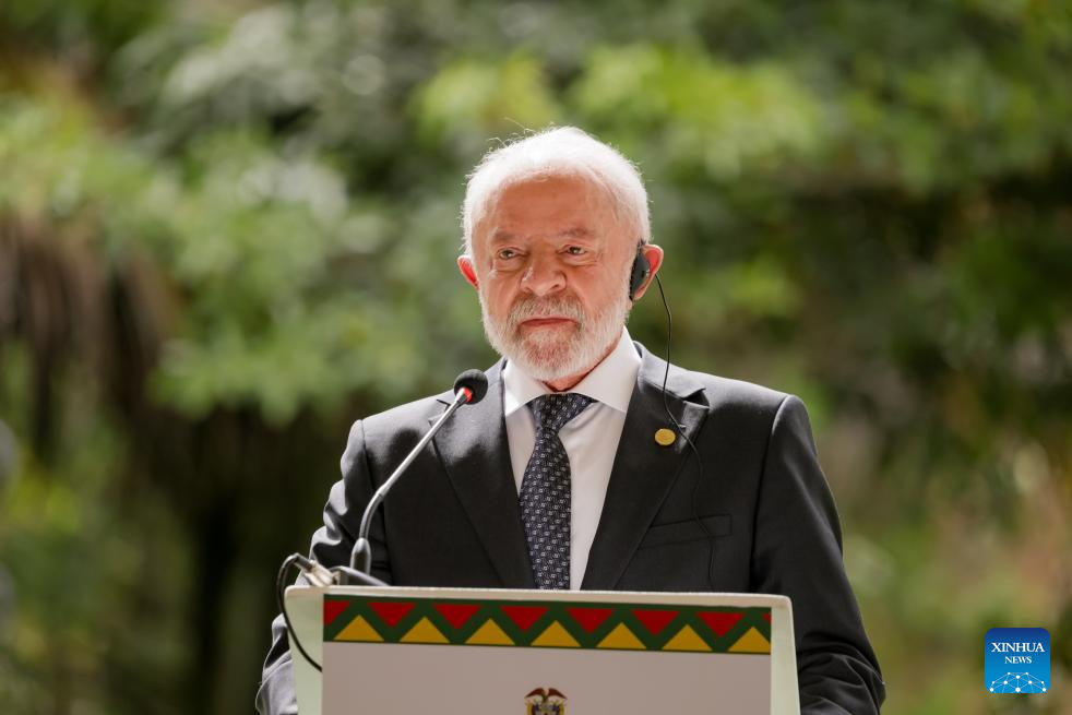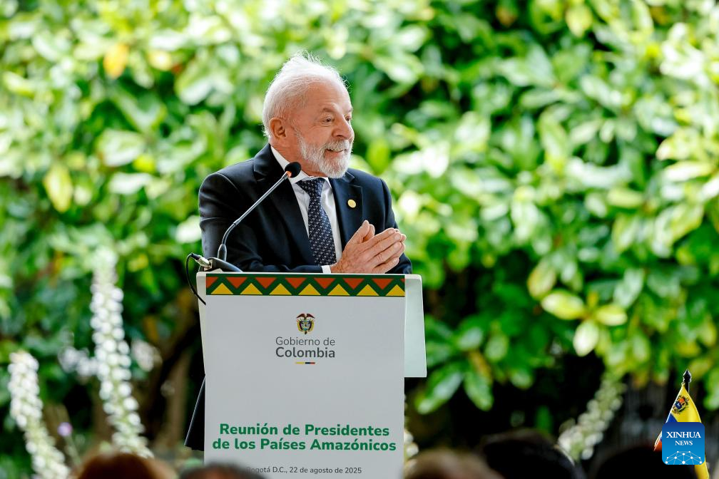 BOGOTA, 22 agosto, 2025 (Xinhua) -- Imagen proveída por la Presidencia de Colombia del presidente brasileño, Luiz Inácio Lula da Silva, hablando en una declaración conjunta en el marco de la cumbre presidencial de la Organización del Tratado de Cooperación Amazónica (OTCA), en Bogotá, capital de Colombia, el 22 de agosto de 2025. Los presidentes de Brasil, Luiz Inácio Lula da Silva, y de Colombia, Gustavo Petro, anunciaron medidas conjuntas para hacer frente al narcotráfico y otras economías ilegales que amenazan la región amazónica, en el marco de la cumbre presidencial de la OTCA que se celebró el viernes en Bogotá, la capital colombiana. (Xinhua/Presidencia de Colombia)