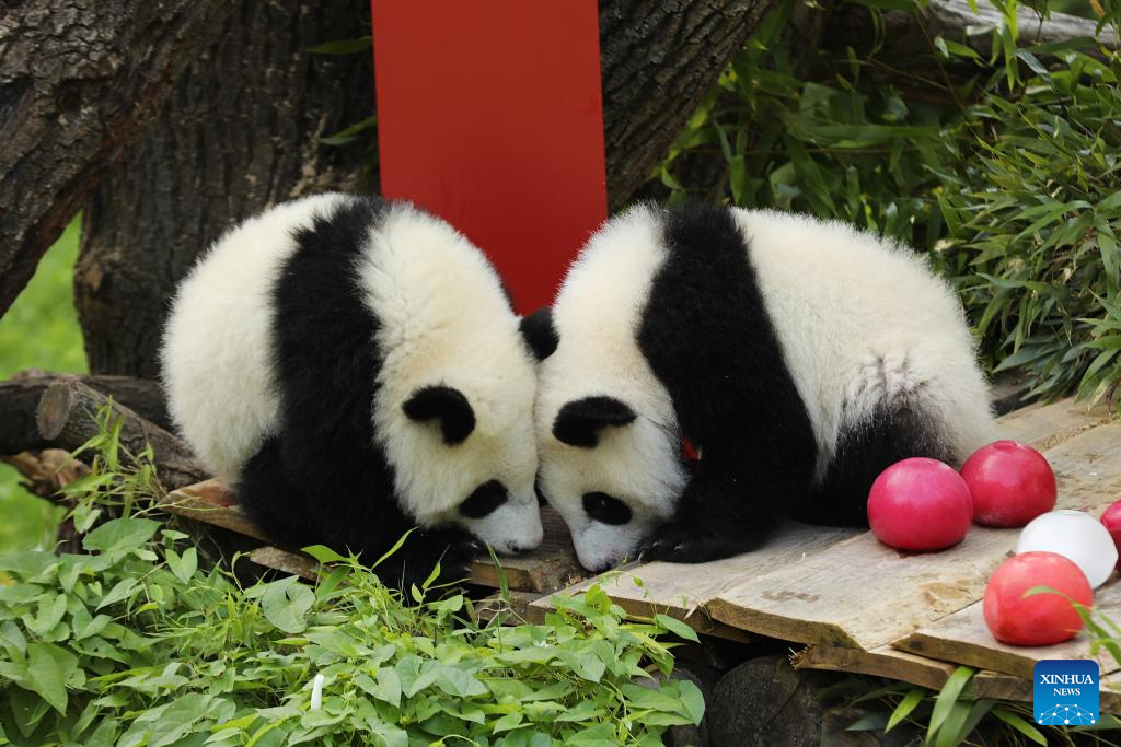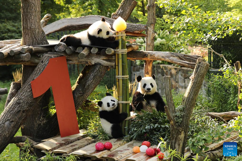 BERLIN, 22 agosto, 2025 (Xinhua) -- Las pandas gigantes Leni (i) y Lotti, conocidas en chino como Meng Hao y Meng Tian, son vistas en el Zoológico de Berlín, en Berlín, Alemania, el 22 de agosto de 2025. Un brillante "1" de madera rojo, coloridos helados elaborados con jugo de remolacha y zanahoria, y una vara de bambú como vela de cumpleaños, así fue el escenario en el recinto de pandas del Zoológico de Berlín el viernes, cuando las gemelas Leni y Lotti celebraron su primer cumpleaños al más puro estilo panda. (Xinhua/Du Zheyu)