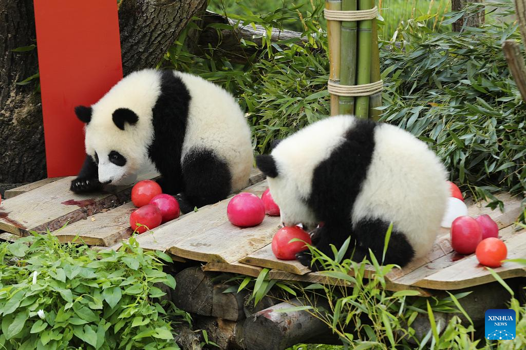 BERLIN, 22 agosto, 2025 (Xinhua) -- Las pandas gigantes Leni (i) y Lotti, conocidas en chino como Meng Hao y Meng Tian, son vistas en el Zoológico de Berlín, en Berlín, Alemania, el 22 de agosto de 2025. Un brillante "1" de madera rojo, coloridos helados elaborados con jugo de remolacha y zanahoria, y una vara de bambú como vela de cumpleaños, así fue el escenario en el recinto de pandas del Zoológico de Berlín el viernes, cuando las gemelas Leni y Lotti celebraron su primer cumpleaños al más puro estilo panda.(Xinhua/Du Zheyu)
