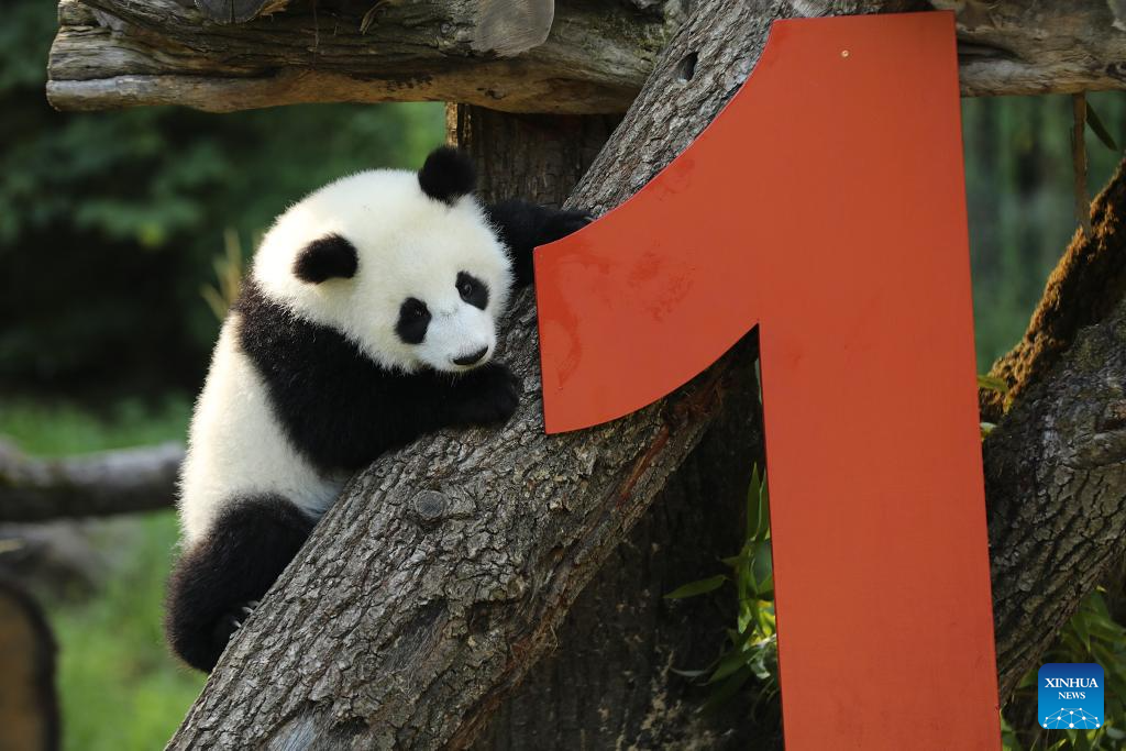 BERLIN, 22 agosto, 2025 (Xinhua) -- La panda gigante Lotti, conocida en chino como Meng Tian, es vista en el Zoológico de Berlín, en Berlín, Alemania, el 22 de agosto de 2025. Un brillante "1" de madera rojo, coloridos helados elaborados con jugo de remolacha y zanahoria, y una vara de bambú como vela de cumpleaños, así fue el escenario en el recinto de pandas del Zoológico de Berlín el viernes, cuando las gemelas Leni y Lotti celebraron su primer cumpleaños al más puro estilo panda.(Xinhua/Du Zheyu)