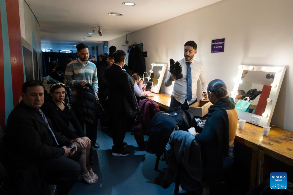 Concursantes se preparan para participar en la ronda clasificatoria de la categoría de "Tango de Pista" durante la primera jornada del Campeonato Mundial de Tango, en la Usina del Arte, en la ciudad de Buenos Aires, capital de Argentina, el 23 de agosto de 2025. (Xinhua/Martín Zabala)
