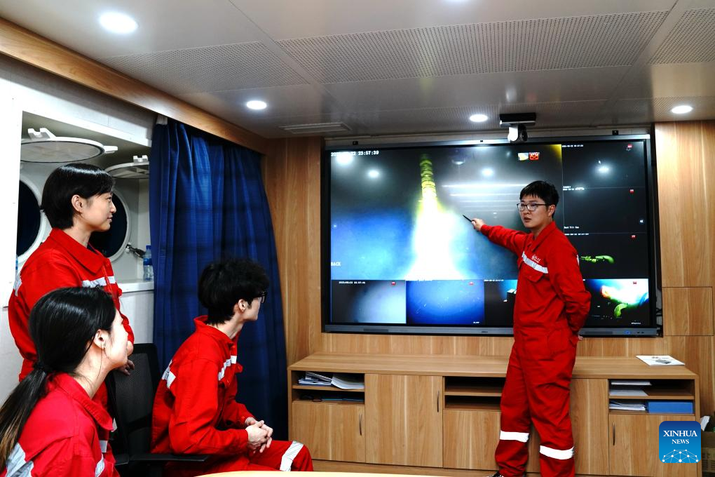 Imagen del 22 de agosto de 2025 de miembros de la expedición de investigación observando y discutiendo sobre las imágenes enviadas por el vehículo submarino chino operado por control remoto (ROV, por sus siglas en inglés) Haiqin, con capacidad de descender hasta 6.000 metros, a bordo del buque Zhong Shan Da Xue, en el Mar Meridional de China. El sistema ROV eléctrico de aguas profundas, con capacidad de descender hasta 6.000 metros, completó con éxito un viaje a aguas profundas en el Mar Meridional de China, informaron científicos a la Agencia de Noticias Xinhua. El sistema ROV eléctrico de aguas profundas nombrado Haiqin, que fue diseñado y construido por la Universidad Jiao Tong de Shanghai, alcanzó una profundidad de 4.140 metros, como parte de su reciente prueba en el mar, llevada a cabo durante la madrugada del sábado. Equipado con cámaras de alta definición, brazos robóticos, sistemas de sonar y sensores, el vehículo demostró capacidades que incluyen control automático de rumbo y navegación estacionaria precisa. (Xinhua/Zhang Jiansong)