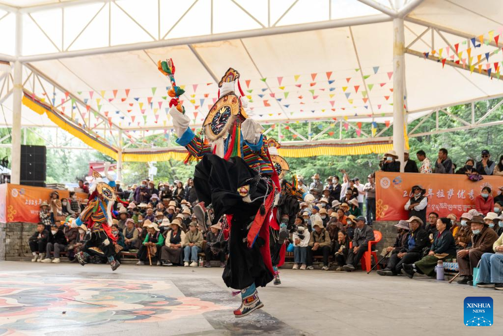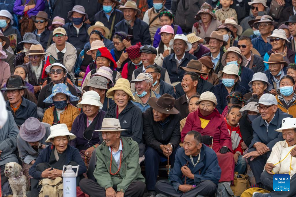 LHASA, 24 agosto, 2025 (Xinhua) -- Personas observan presentaciones de las óperas tibetanas, en Lhasa, en la región autónoma Xizang, en el suroeste de China, el 24 de agosto de 2025. Representaciones de la ópera tibetana son realizadas del 23 al 27 de agosto en celebración del tradicional Festival Shoton, o Festival del Yogurt, y el 60 aniversario de fundación de la región autónoma. (Xinhua/Tenzing Nima Qadhup)
