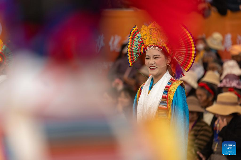 LHASA, 24 agosto, 2025 (Xinhua) -- Una artista participa en las presentaciones de las óperas tibetanas, en Lhasa, en la región autónoma Xizang, en el suroeste de China, el 24 de agosto de 2025. Representaciones de la ópera tibetana son realizadas del 23 al 27 de agosto en celebración del tradicional Festival Shoton, o Festival del Yogurt, y el 60 aniversario de fundación de la región autónoma. (Xinhua/Tenzing Nima Qadhup)