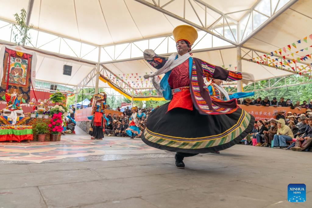 LHASA, 24 agosto, 2025 (Xinhua) -- Un artista participa en las presentaciones de las óperas tibetanas, en Lhasa, en la región autónoma Xizang, en el suroeste de China, el 24 de agosto de 2025. Representaciones de la ópera tibetana son realizadas del 23 al 27 de agosto en celebración del tradicional Festival Shoton, o Festival del Yogurt, y el 60 aniversario de fundación de la región autónoma. (Xinhua/Tenzing Nima Qadhup)