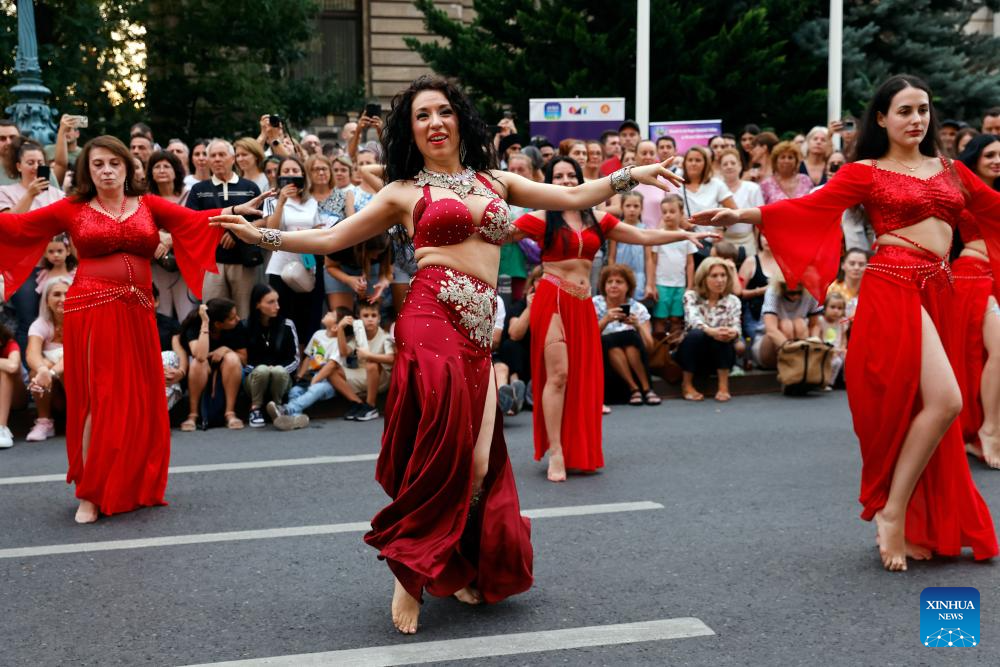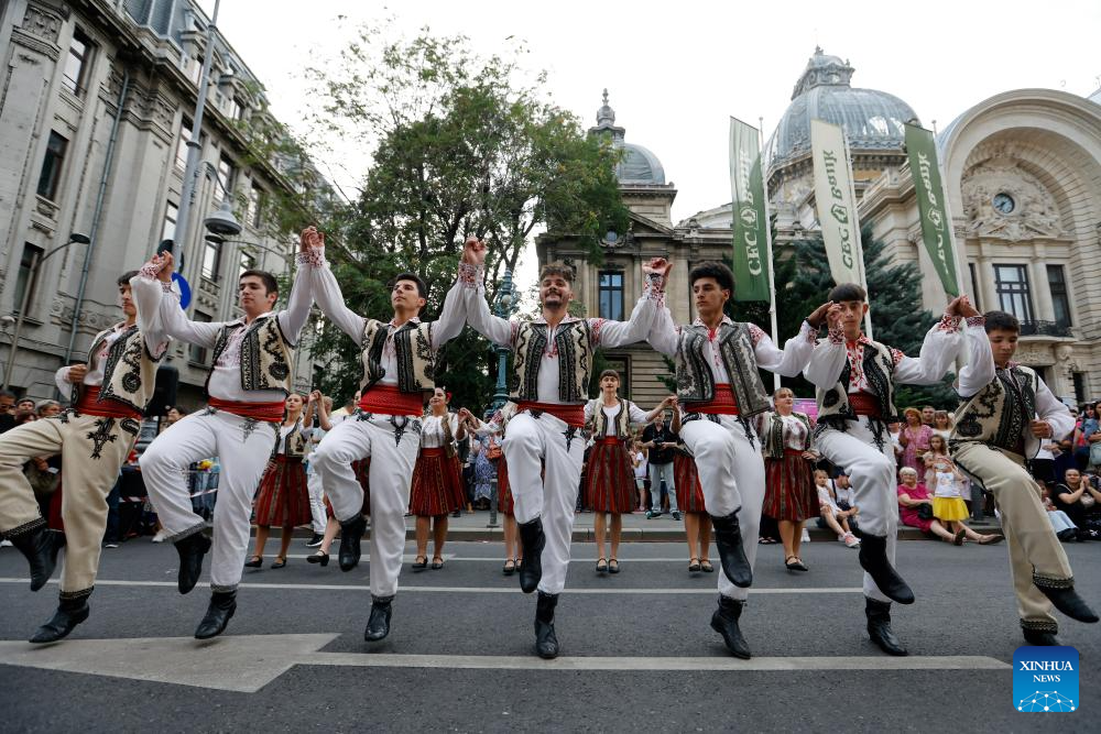 BUCAREST, 24 agosto, 2025 (Xinhua) -- Imagen del 23 de agosto de 2025 de miembros de un tradicional grupo de baile realizando una presentación durante el evento Noche de Baile en Calea Victoriei, en Bucarest, Rumanía. Alrededor de 20 escuelas de baile participaron en la quinta edición del evento, en el que se exhibieron más de 15 estilos de baile. (Xinhua/Cristian Cristel)