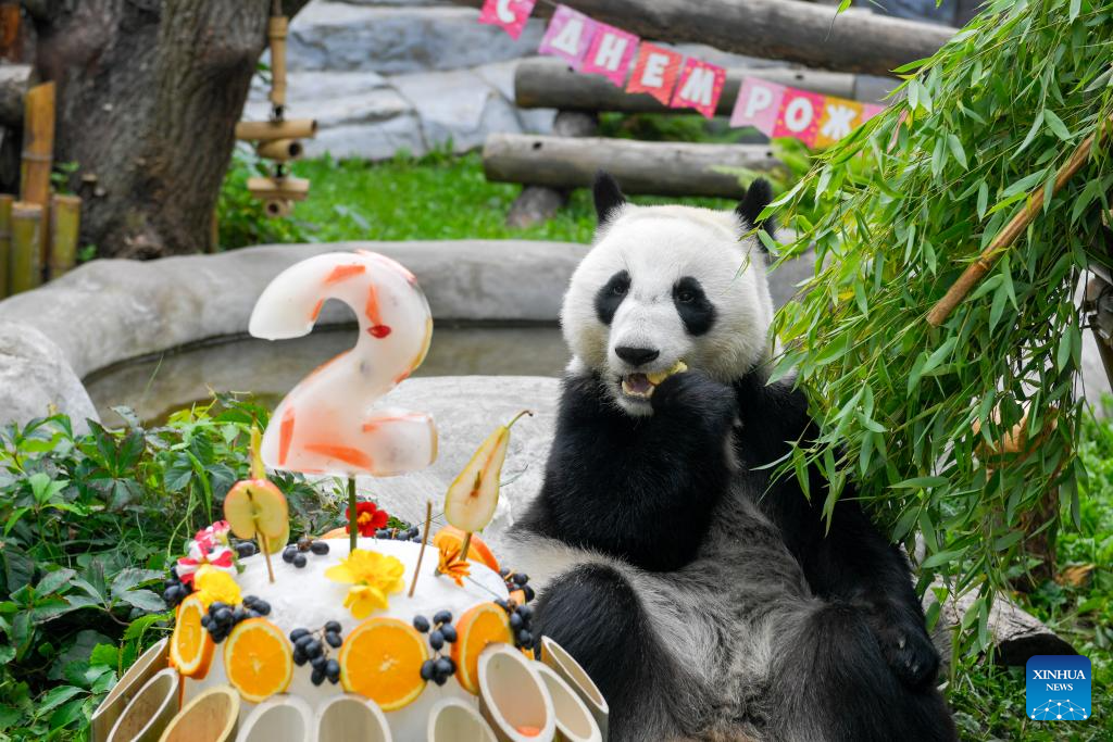 MOSCU, 24 agosto, 2025 (Xinhua) -- La panda gigante Katyusha disfruta de un pastel de cumpleaños de hielo preparado por los cuidadores del Zoológico de Moscú, en Moscú, Rusia, el 24 de agosto de 2025. Katyusha, la primera cría de panda gigante nacida en el Zoológico de Moscú, celebró su segundo cumpleaños el domingo. (Xinhua/Alexander Zemlianichenko Jr)