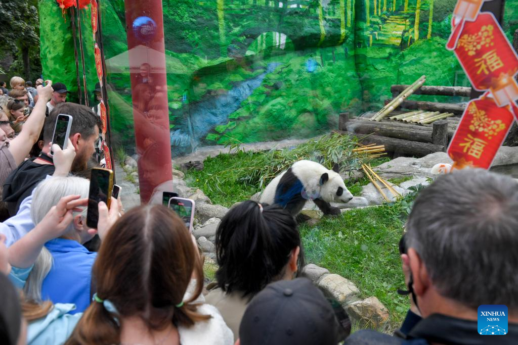 MOSCU, 24 agosto, 2025 (Xinhua) -- Personas toman fotografías de la panda gigante Katyusha en el Zoológico de Moscú, en Moscú, Rusia, el 24 de agosto de 2025. Katyusha, la primera cría de panda gigante nacida en el Zoológico de Moscú, celebró su segundo cumpleaños el domingo. (Xinhua/Alexander Zemlianichenko Jr)