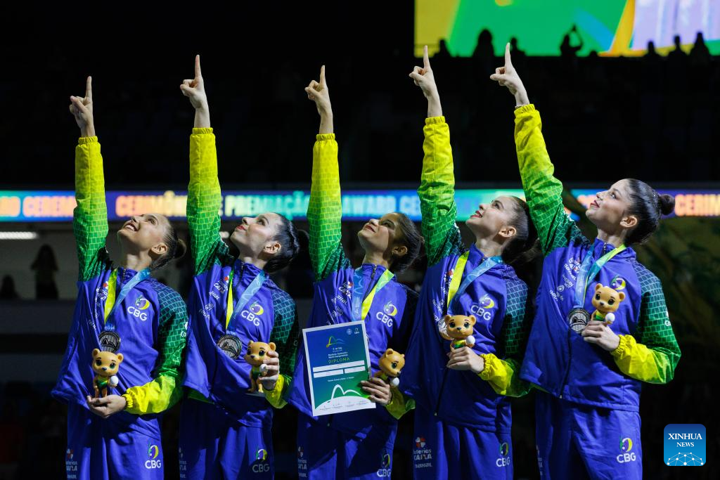 RIO DE JANEIRO, 25 agosto, 2025 (Xinhua) -- Imagen del 24 de agosto de 2025 de las medallistas de plata, el equipo de Brasil, reaccionando durante la ceremonia de premiación de la final de 3 pelotas y dos aros grupal, en el 41º Campeonato Mundial de Gimnasia Rítmica de la FIG, en Río de Janeiro, Brasil. (Xinhua/Claudia Martini)