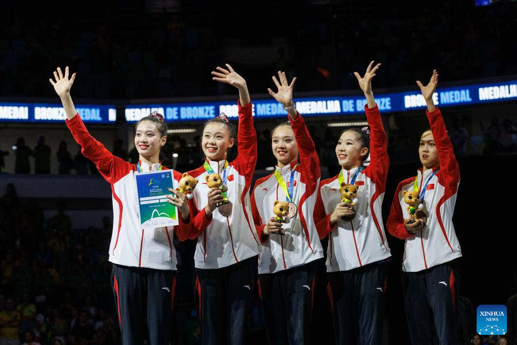 RIO DE JANEIRO, 25 agosto, 2025 (Xinhua) -- Imagen del 24 de agosto de 2025 de las medallistas de bronce, el equipo de China, posando con sus medallas durante la ceremonia de premiación de la final de 3 pelotas y dos aros grupal, en el 41º Campeonato Mundial de Gimnasia Rítmica de la FIG, en Río de Janeiro, Brasil. (Xinhua/Claudia Martini)