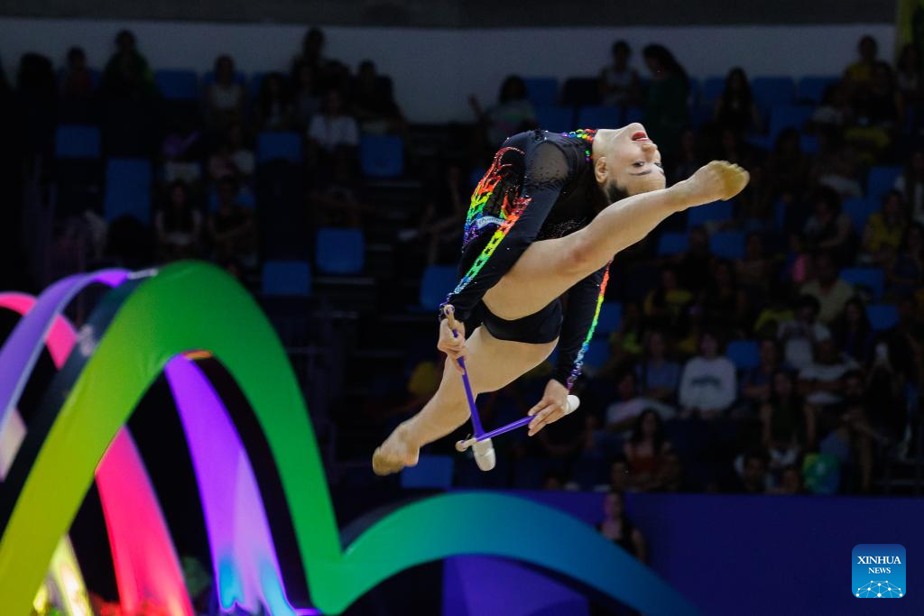 RIO DE JANEIRO, 25 agosto, 2025 (Xinhua) -- Imagen del 24 de agosto de 2025 de Taisiia Onofriichuk, de Ucrania, compitiendo durante la final individual de cintas en el 41º Campeonato Mundial de Gimnasia Rítmica de la FIG, en Río de Janeiro, Brasil. (Xinhua/Claudia Martini)