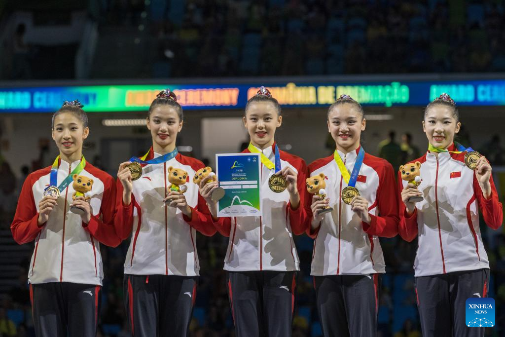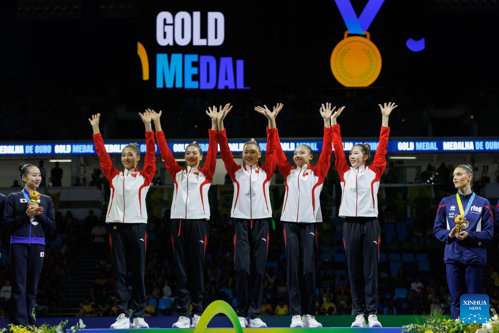 RIO DE JANEIRO, 25 agosto, 2025 (Xinhua) -- Imagen del 24 de agosto de 2025 de las medallistas de oro, el equipo de China, posando durante la ceremonia de premiación de la final de 5 cintas grupal, en el 41º Campeonato Mundial de Gimnasia Rítmica de la FIG, en Río de Janeiro, Brasil. (Xinhua/Claudia Martini)