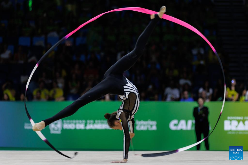 RIO DE JANEIRO, 25 agosto, 2025 (Xinhua) -- Imagen del 24 de agosto de 2025 de Darja Varfolomeev, de Alemania, compitiendo durante la final individual de cintas en el 41º Campeonato Mundial de Gimnasia Rítmica de la FIG, en Río de Janeiro, Brasil. (Xinhua/Claudia Martini)