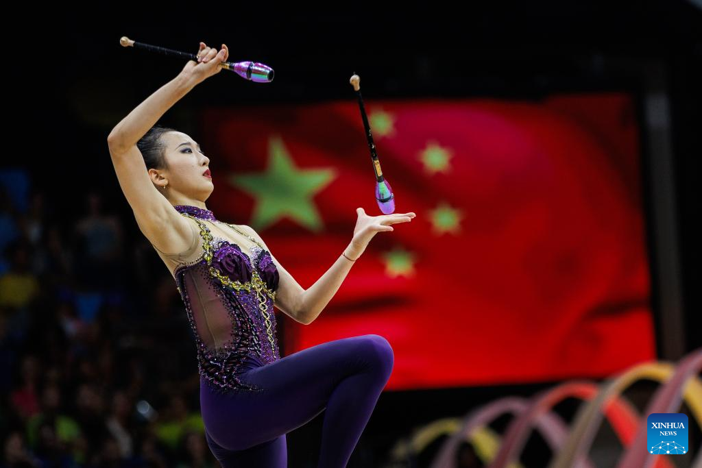 RIO DE JANEIRO, 25 agosto, 2025 (Xinhua) -- Imagen del 24 de agosto de 2025 de Wang Zilu, de China, compitiendo durante la final individual de mazas, en el 41º Campeonato Mundial de Gimnasia Rítmica de la FIG, en Río de Janeiro, Brasil. (Xinhua/Claudia Martini)