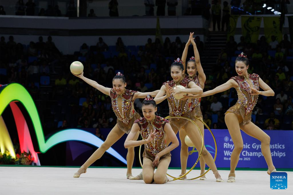 RIO DE JANEIRO, 25 agosto, 2025 (Xinhua) -- Imagen del 24 de agosto de 2025 del equipo de China compitiendo durante la final de 3 pelotas y dos aros grupal, en el 41º Campeonato Mundial de Gimnasia Rítmica de la FIG, en Río de Janeiro, Brasil. (Xinhua/Claudia Martini)