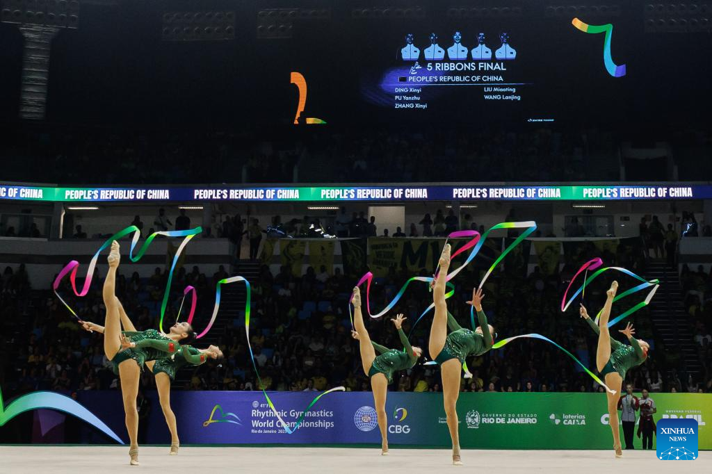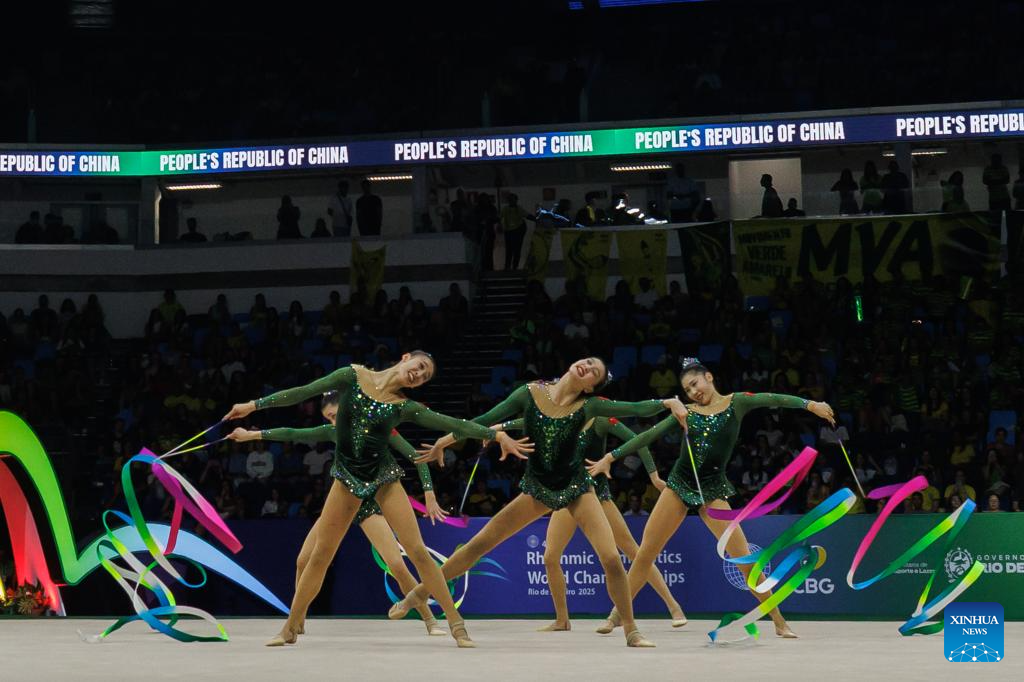 RIO DE JANEIRO, 25 agosto, 2025 (Xinhua) -- Imagen del 24 de agosto de 2025 del equipo de China compitiendo durante la final de 5 cintas grupal, en el 41º Campeonato Mundial de Gimnasia Rítmica de la FIG, en Río de Janeiro, Brasil. (Xinhua/Claudia Martini)