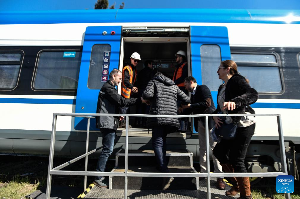 Imagen del 25 de agosto de 2025 de personas abordando un tren luego de participar en la ceremonia de firma de un contrato ferroviario, en Santiago, capital de Chile. El contrato más grande en la historia de la Empresa de Ferrocarriles del Estado de Chile se firmó el lunes con el consorcio Constructora Gran Andes SpA, integrado por China Railway Construction Corporation y sus filiales, para ejecutar las obras civiles y ferroviarias del futuro trayecto de tren Santiago-Batuco, que conectará la zona norte de la capital chilena con trenes eléctricos. (Xinhua/Jorge Villegas)