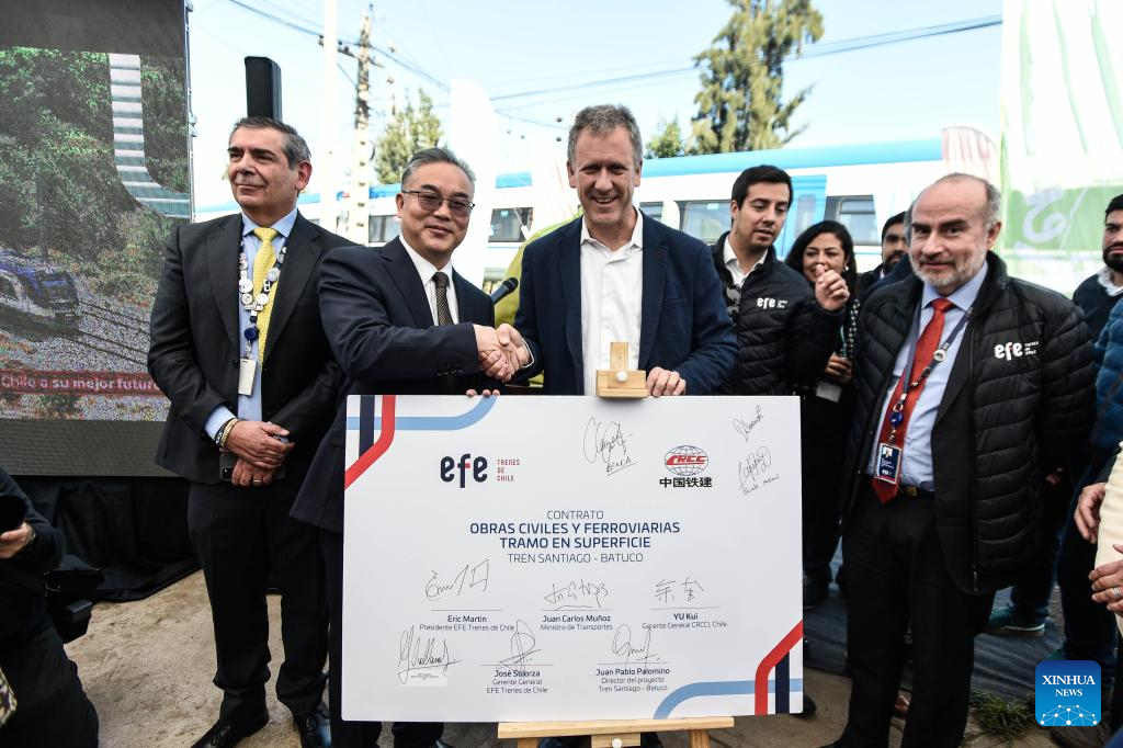 SANTIAGO, 25 ago (Xinhua) -- El contrato más grande en la historia de la Empresa de Ferrocarriles del Estado (EFE) de Chile se firmó este lunes con el consorcio Constructora Gran Andes SpA, integrado por China Railway Construction Corporation (CRCC) y sus filiales, para ejecutar las obras civiles y ferroviarias del futuro trayecto de tren Santiago-Batuco, que conectará la zona norte de la capital chilena con trenes eléctricos.