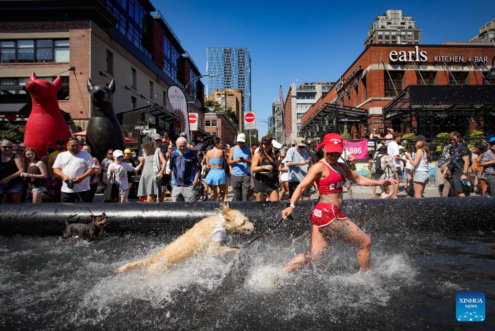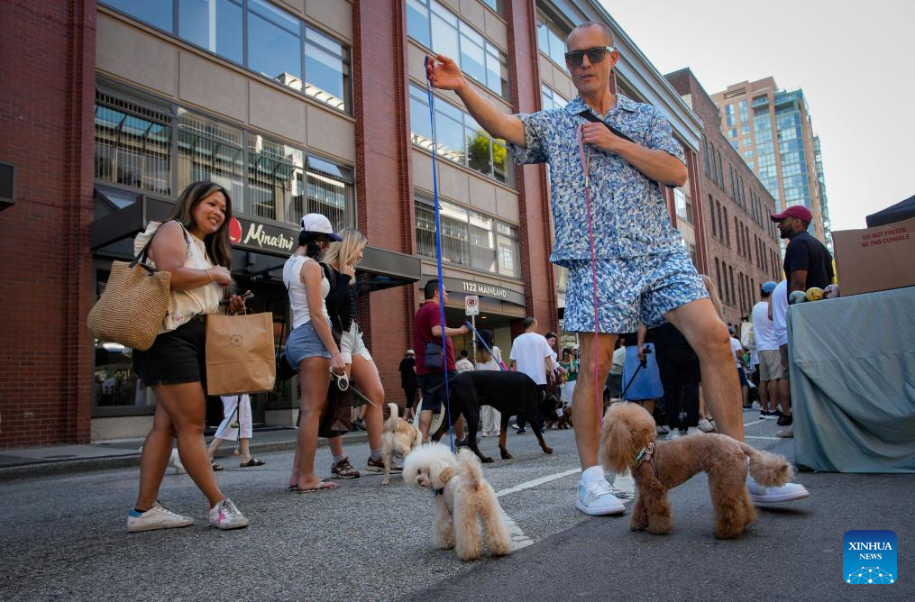 VANCOUVER, 25 agosto de 2025 (Xinhua) -- Imagen del 24 de agosto de 2025 de personas paseando a sus perros por una calle durante el evento "Pet-A-Palooza", en Vancouver, Columbia Británica, Canadá. "Pet-A-Palooza", también conocido como el Día del Perro, es una celebración anual de verano para los cachorros locales y sus dueños. El evento ofreció una variedad de actividades y entretenimiento relacionados con los perros, atrayendo a miles de dueños de perros y sus peludos compañeros. (Xinhua/Liang Sen)