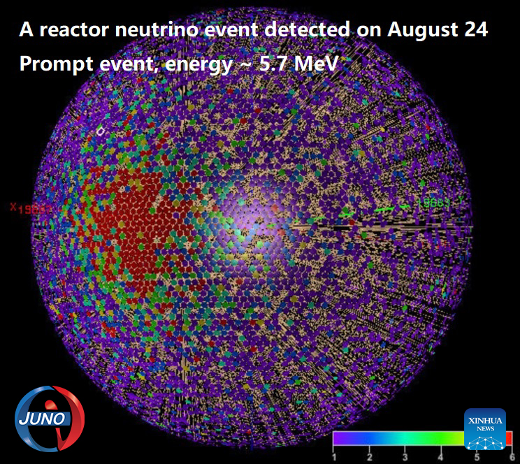 BEIJING, 26 agosto, 2025 (Xinhua) -- Imagen del 24 de agosto de 2025 de un diagrama esquemático de un evento de neutrinos de reactor detectado por el Observatorio Subterráneo de Neutrinos de Jiangmen (JUNO), en Jiangmen, en la provincia de Guangdong, en el sur de China. El detector esférico transparente más grande del mundo comenzó a operar el martes en China, convirtiéndose en la primera instalación científica ultragrande del mundo en funcionamiento dedicada a la investigación de neutrinos con precisión ultraalta. Tras completar el llenado de su detector de centelleo líquido de 20.000 toneladas, JUNO, en Guangdong, comenzó a recopilar datos tras más de una década de preparación y construcción. (Xinhua)