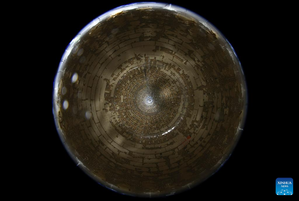 BEIJING, 26 agosto, 2025 (Xinhua) -- Imagen del 17 de diciembre de 2024 de tubos fotomultiplicadores vistos desde la parte superior de la esfera acrílica del detector de centelleo líquido en el Observatorio Subterráneo de Neutrinos de Jiangmen (JUNO), en Jiangmen, en la provincia de Guangdong, en el sur de China. El detector esférico transparente más grande del mundo comenzó a operar el martes en China, convirtiéndose en la primera instalación científica ultragrande del mundo en funcionamiento dedicada a la investigación de neutrinos con precisión ultraalta. Tras completar el llenado de su detector de centelleo líquido de 20.000 toneladas, JUNO, en Guangdong, comenzó a recopilar datos tras más de una década de preparación y construcción. (Xinhua/Jin Liwang)