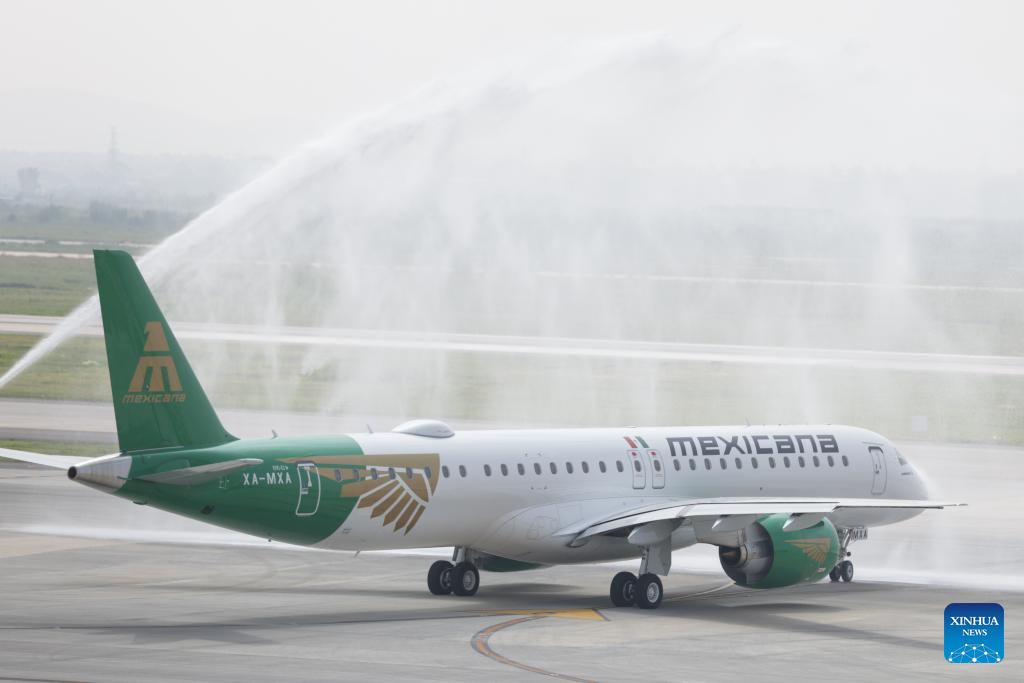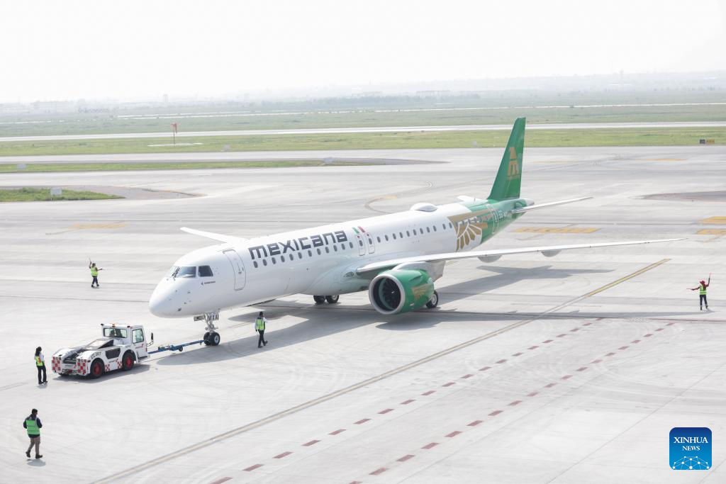 ZUMPANGO, 25 agosto, 2025 (Xinhua) -- Imagen del 25 de agosto de 2025 de la aeronave EMBRAER E-195 de la Aerolínea del Estado Mexicano "Mexicana" vista previo a su primer vuelo en el Aeropuerto Internacional Felipe Angeles, en Zumpango, México. (Xinhua/Francisco Cañedo)