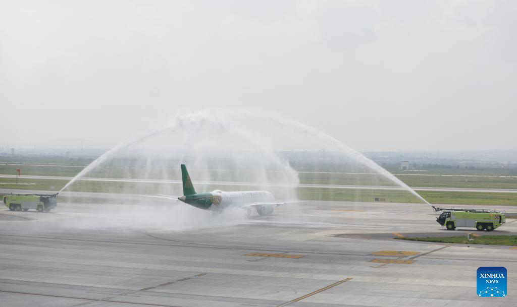 ZUMPANGO, 25 agosto, 2025 (Xinhua) -- Imagen del 25 de agosto de 2025 de la aeronave EMBRAER E-195 de la Aerolínea del Estado Mexicano "Mexicana" recibiendo un saludo de agua previo a su primer vuelo en el Aeropuerto Internacional Felipe Angeles, en Zumpango, México. (Xinhua/Francisco Cañedo)