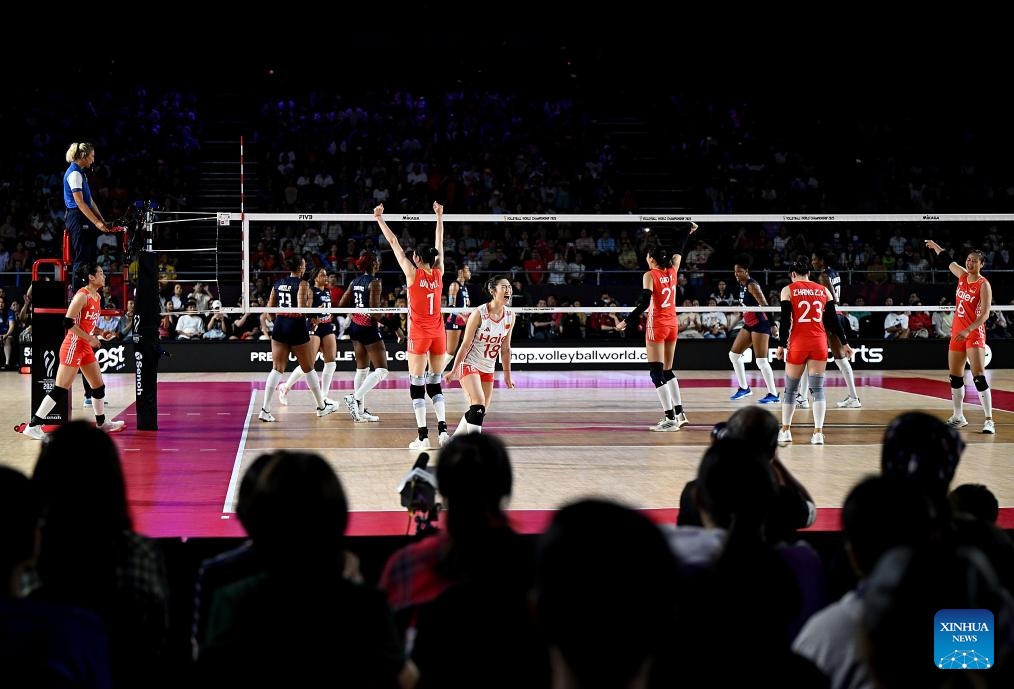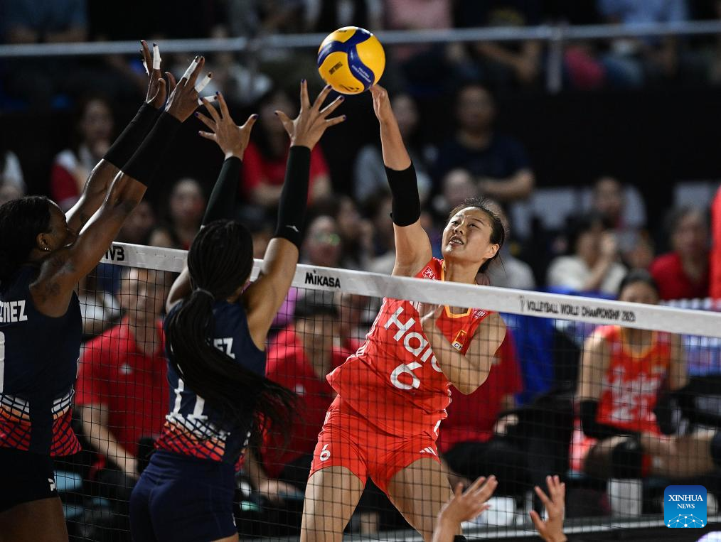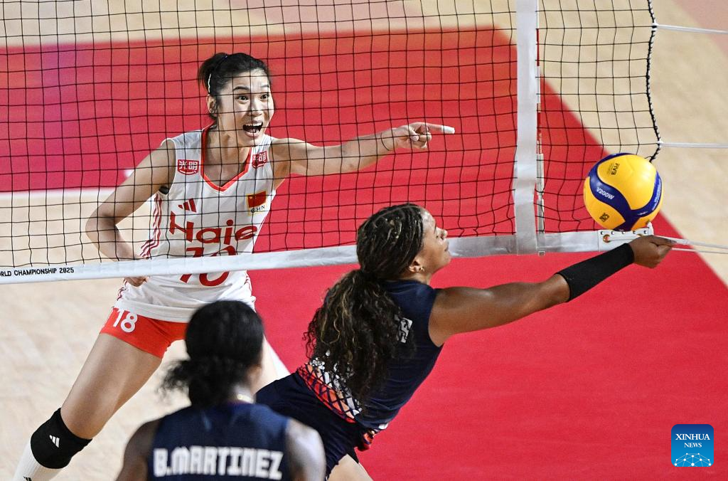 CHIANG MAI, 27 agosto, 2025 (Xinhua) -- Wang Mengjie (i), de China, reacciona durante el partido del grupo F de la fase preliminar entre China y República Dominicana en el Campeonato Mundial de Voleibol Femenino, en Chiang Mai, Tailandia, el 27 de agosto de 2025. (Xinhua/Hou Zhaokang)