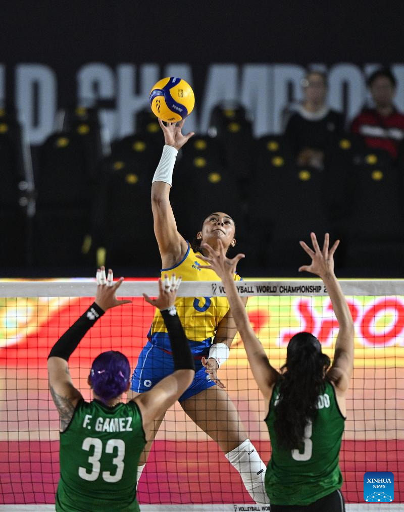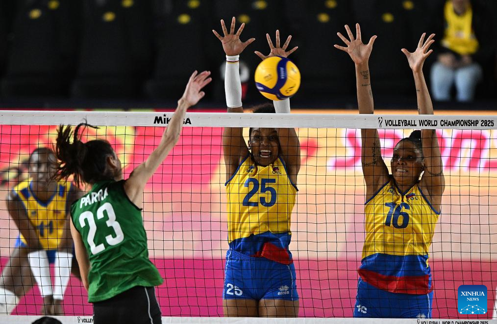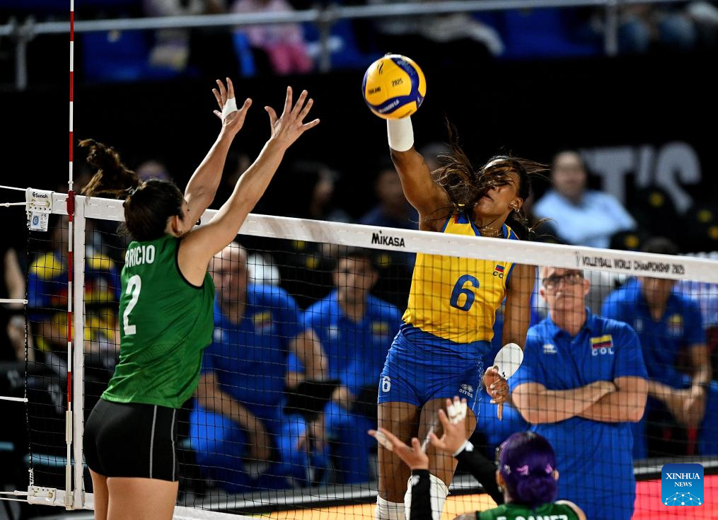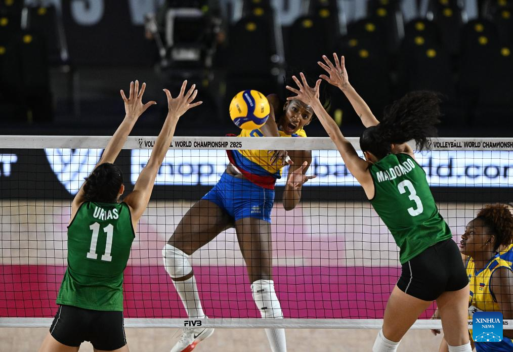 CHIANG MAI, 27 agosto, 2025 (Xinhua) -- Ana Karina Olaya Gamboa (c), de Colombia, clava el balón durante el partido del grupo F de la fase preliminar entre Colombia y México, en el Campeonato Mundial de Voleibol Femenino, en Chiang Mai, Tailandia, el 27 de agosto de 2025. (Xinhua/Hou Zhaokang)