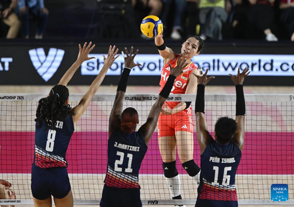 CHIANG MAI, 27 agosto, 2025 (Xinhua) -- Zhuang Yushan (2-d), de China, clava el balón durante el partido del grupo F de la fase preliminar entre China y República Dominicana en el Campeonato Mundial de Voleibol Femenino, en Chiang Mai, Tailandia, el 27 de agosto de 2025. (Xinhua/Hou Zhaokang)