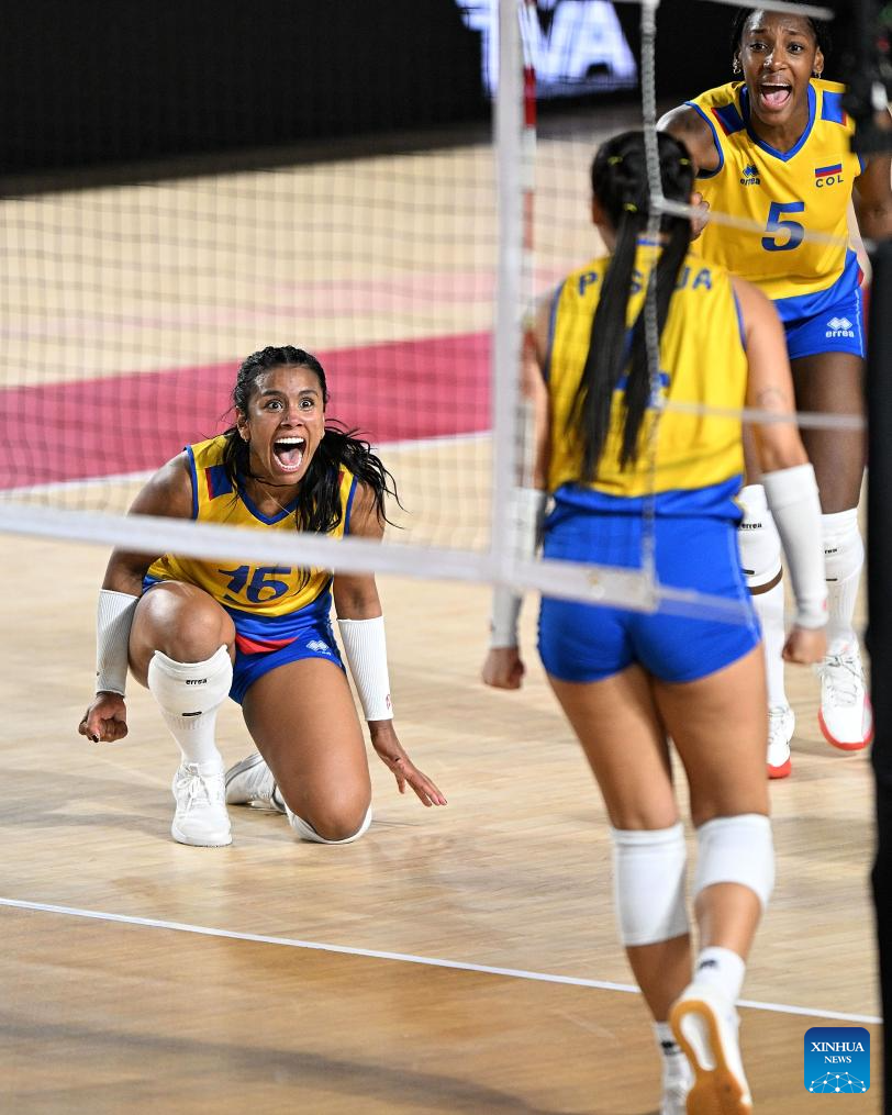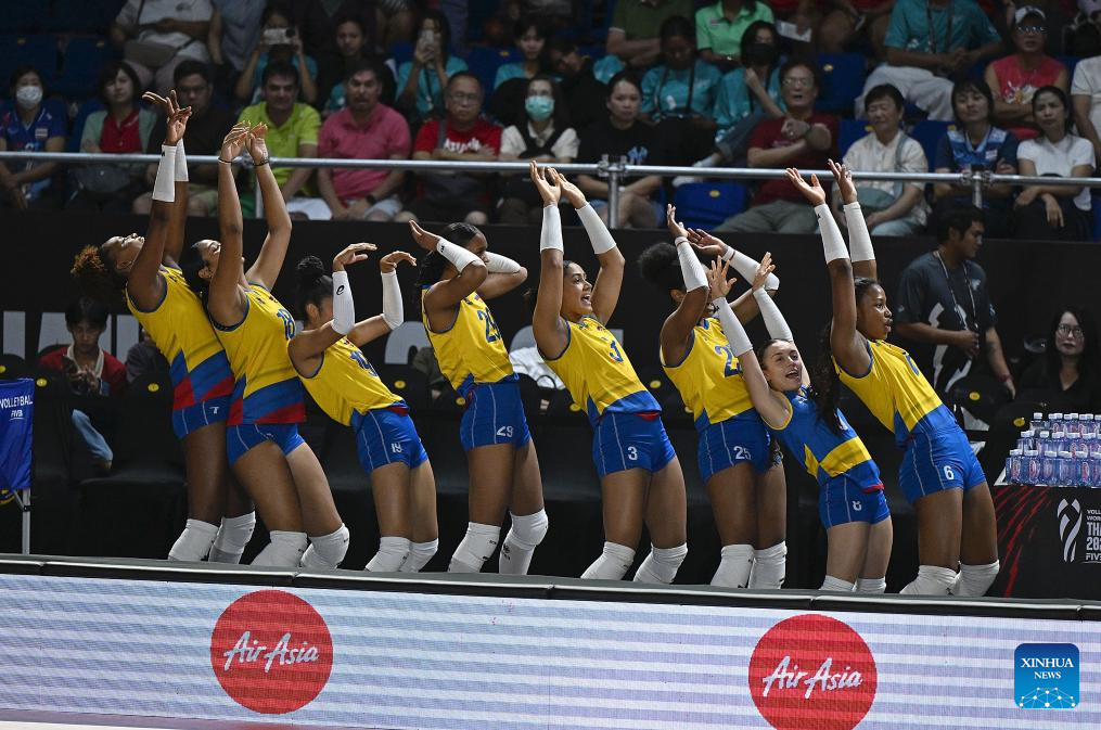 CHIANG MAI, 27 agosto, 2025 (Xinhua) -- Jugadoras de Colombia reaccionan durante el partido del grupo F de la fase preliminar entre Colombia y México, en el Campeonato Mundial de Voleibol Femenino, en Chiang Mai, Tailandia, el 27 de agosto de 2025. (Xinhua/Hou Zhaokang)