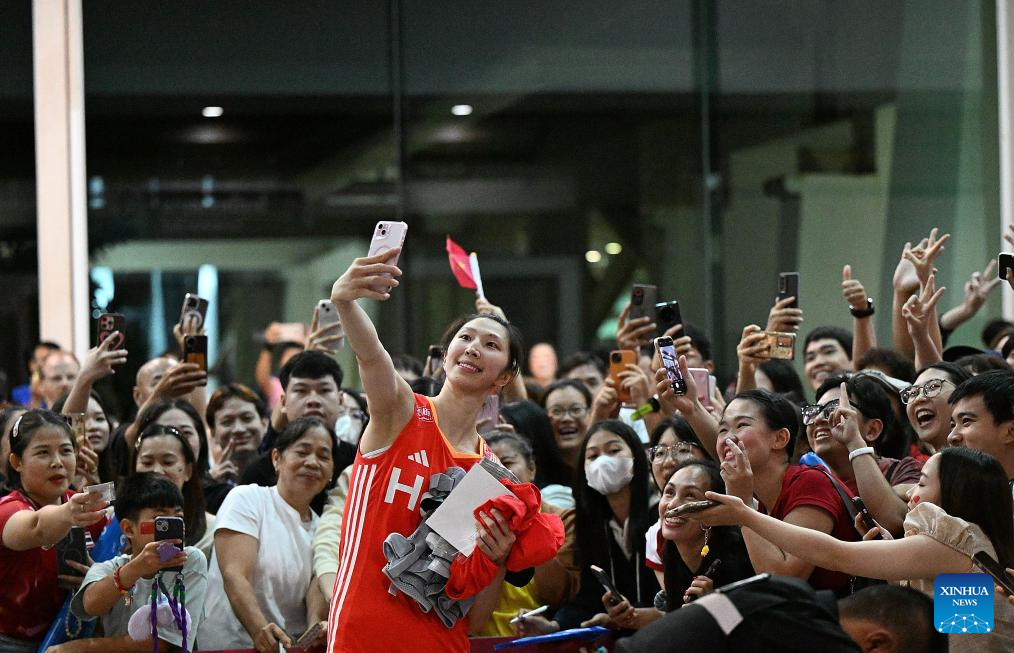 CHIANG MAI, 27 agosto, 2025 (Xinhua) -- Wu Mengjie (frente), de China, posa con aficionados al término del partido del grupo F de la fase preliminar entre China y República Dominicana en el Campeonato Mundial de Voleibol Femenino, en Chiang Mai, Tailandia, el 27 de agosto de 2025. (Xinhua/Hou Zhaokang)
