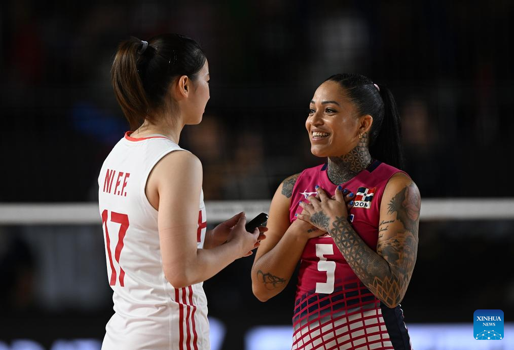 CHIANG MAI, 27 agosto, 2025 (Xinhua) -- Ni Feifan (i), de China, conversa con Brenda Castillo, de República Dominicana, al término del partido del grupo F de la fase preliminar entre China y República Dominicana en el Campeonato Mundial de Voleibol Femenino, en Chiang Mai, Tailandia, el 27 de agosto de 2025. (Xinhua/Hou Zhaokang)