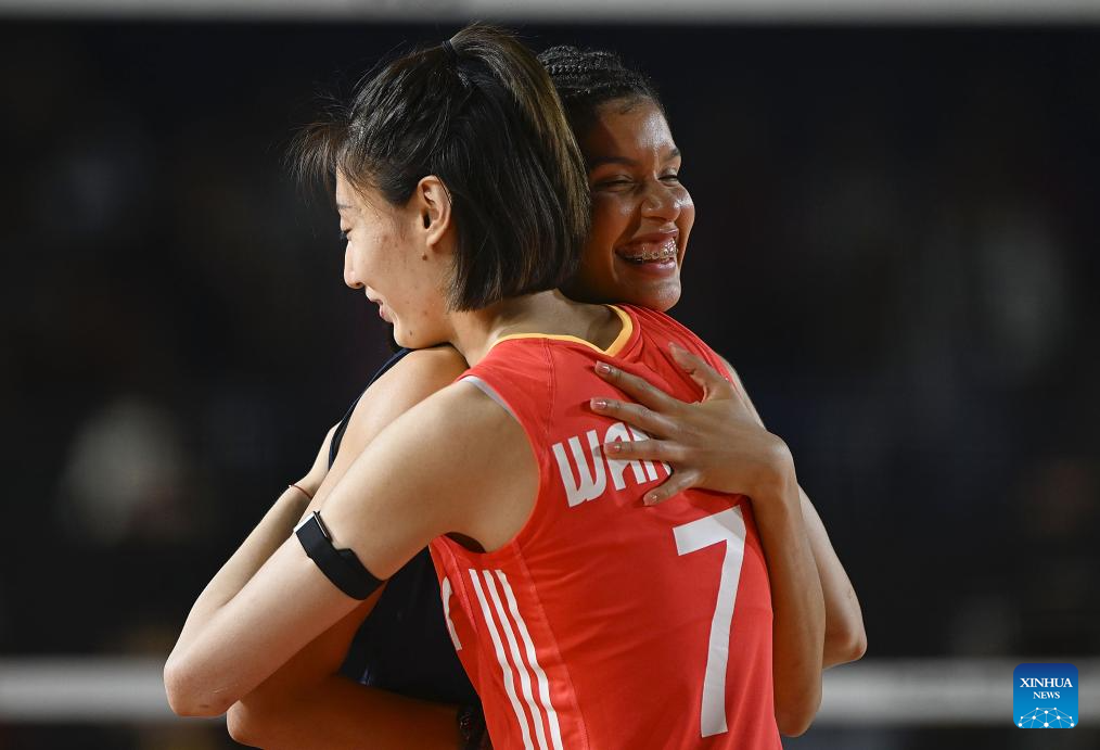 CHIANG MAI, 27 agosto, 2025 (Xinhua) -- Wang Yuanyuan (frente), de China, abraza a Alondra Denis Tapia Cruz, de República Dominicana, al término del partido del grupo F de la fase preliminar entre China y República Dominicana en el Campeonato Mundial de Voleibol Femenino, en Chiang Mai, Tailandia, el 27 de agosto de 2025. (Xinhua/Hou Zhaokang)
