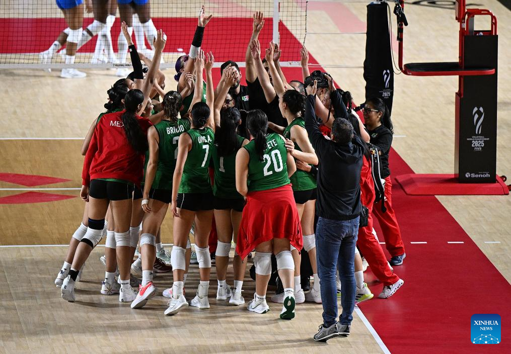 CHIANG MAI, 27 agosto, 2025 (Xinhua) -- Jugadoras de México festejan la victoria al término del partido del grupo F de la fase preliminar entre Colombia y México, en el Campeonato Mundial de Voleibol Femenino, en Chiang Mai, Tailandia, el 27 de agosto de 2025. (Xinhua/Hou Zhaokang)