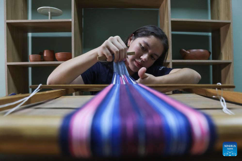 Imagen del 23 de agosto de 2025 de Roxana Artiga, técnico de desarrollo empresarial con énfasis en artesanías, creando una pieza de tejido artesanal en el Centro de Desarrollo Artesanal Interactivo (CEDART), en el departamento de San Salvador, capital de El Salvador. En el centro histórico de San Salvador, la capital salvadoreña, en las inmediaciones de la emblemática plaza Morazán, se levanta un edificio de tres niveles que busca tender un puente entre tradición y modernidad: el CEDART. (Xinhua/Alexander Peña)