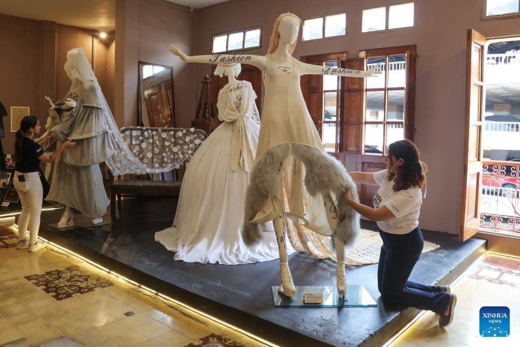 Imagen del 23 de agosto de 2025 de Roxana Artiga (i), técnico de desarrollo empresarial con énfasis en artesanías, y Paola Bustillo (d), acomodando vestuarios en maniquíes en el Centro de Desarrollo Artesanal Interactivo (CEDART), en el departamento de San Salvador, capital de El Salvador. En el centro histórico de San Salvador, la capital salvadoreña, en las inmediaciones de la emblemática plaza Morazán, se levanta un edificio de tres niveles que busca tender un puente entre tradición y modernidad: el CEDART. (Xinhua/Alexander Peña)