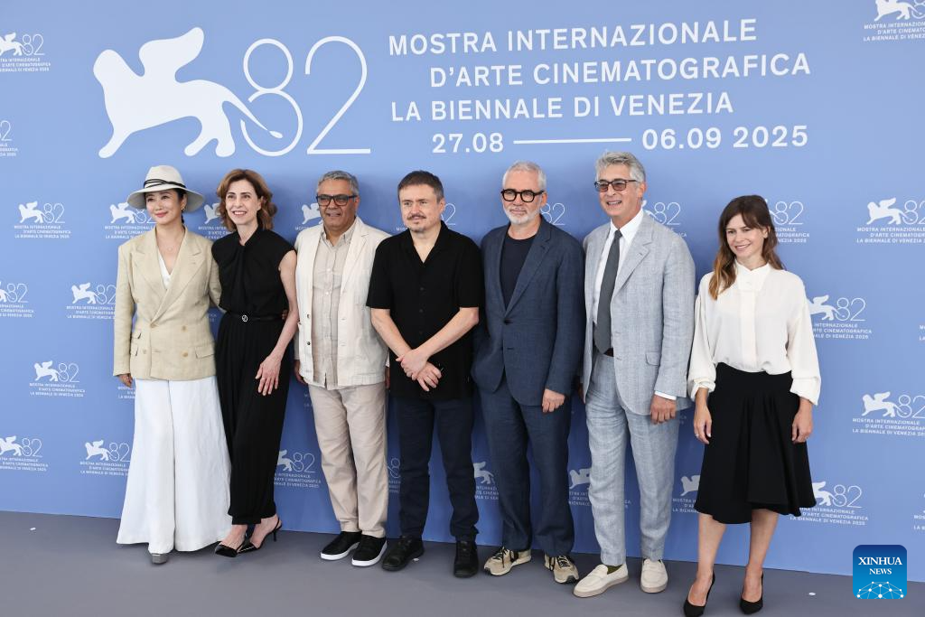 VENECIA, 27 agosto, 2025 (Xinhua) -- Miembros del jurado del 82 Festival Internacional de Cine de Venecia posan en la sesión fotográfica, en Venecia, Italia, el 27 de agosto de 2025. El 82 Festival de Cine de Venecia se celebra del 27 de agosto al 6 de septiembre en la isla del Lido de Venecia, en Italia. (Xinhua/Li Jing)