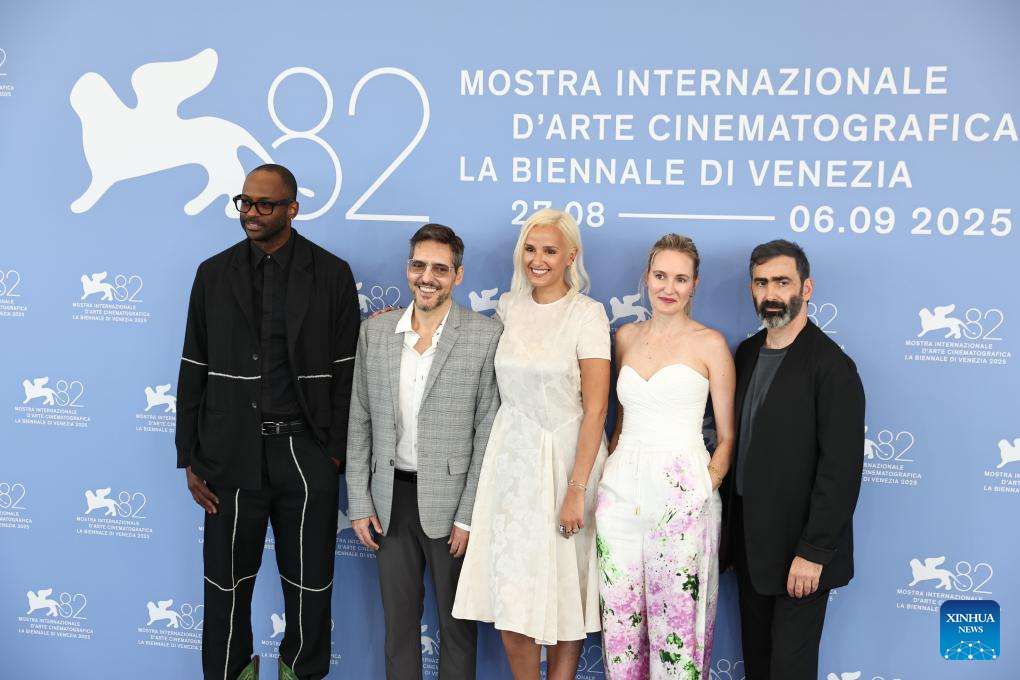VENECIA, 27 agosto, 2025 (Xinhua) -- Miembros del jurado del 82 Festival Internacional de Cine de Venecia de la sección Orizzonti posan en la sesión fotográfica, en Venecia, Italia, el 27 de agosto de 2025. El 82 Festival de Cine de Venecia se celebra del 27 de agosto al 6 de septiembre en la isla del Lido de Venecia, en Italia. (Xinhua/Li Jing)