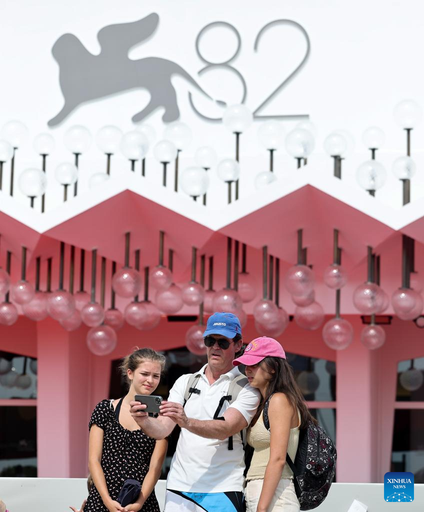 VENECIA, 27 agosto, 2025 (Xinhua) -- Turistas se toman una fotografía frente al Palacio del Cine, en Venecia, Italia, el 27 de agosto de 2025. El 82 Festival de Cine de Venecia se celebra del 27 de agosto al 6 de septiembre en la isla del Lido de Venecia, en Italia. (Xinhua/Li Jing)