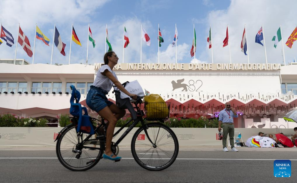 Una mujer circula frente al Palacio del Cine, en Venecia, Italia, el 27 de agosto de 2025. El 82 Festival de Cine de Venecia se celebra del 27 de agosto al 6 de septiembre en la isla del Lido de Venecia, en Italia. (Xinhua/Li Jing)
