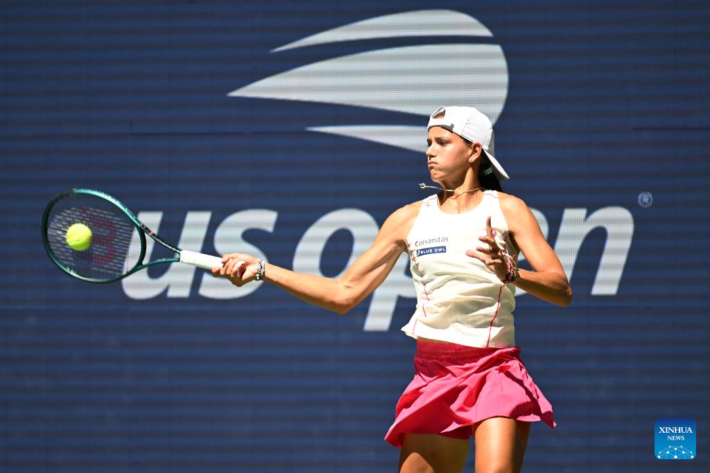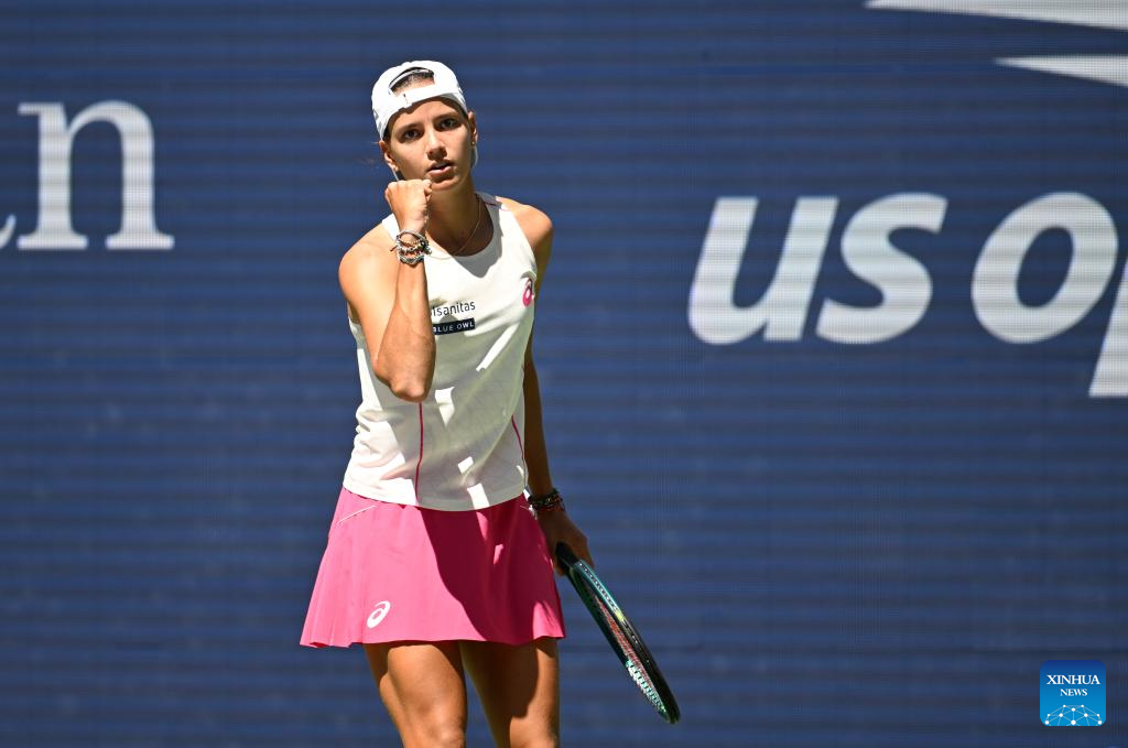 NUEVA YORK, 27 agosto, 2025 (Xinhua) -- Imagen del 26 de agosto de 2025 de Emiliana Arango, de Colombia, festejando un punto durante el partido de la primera ronda de individuales femeninos ante Iga Swiatek, de Polonia, en el campeonato de tenis US Open 2025, en Nueva York, Estados Unidos. (Xinhua/Li Rui)