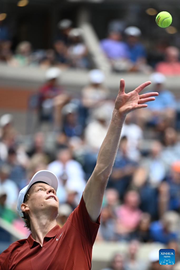 NUEVA YORK, 27 agosto, 2025 (Xinhua) -- Imagen del 26 de agosto de 2025 de Jannik Sinner, de Italia, sirviendo la pelota durante el partido de la primera ronda de individuales masculinos ante Vit Kopriva, de República Checa, en el campeonato de tenis US Open 2025, en Nueva York, Estados Unidos. (Xinhua/Li Rui)