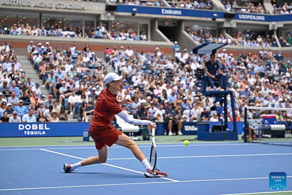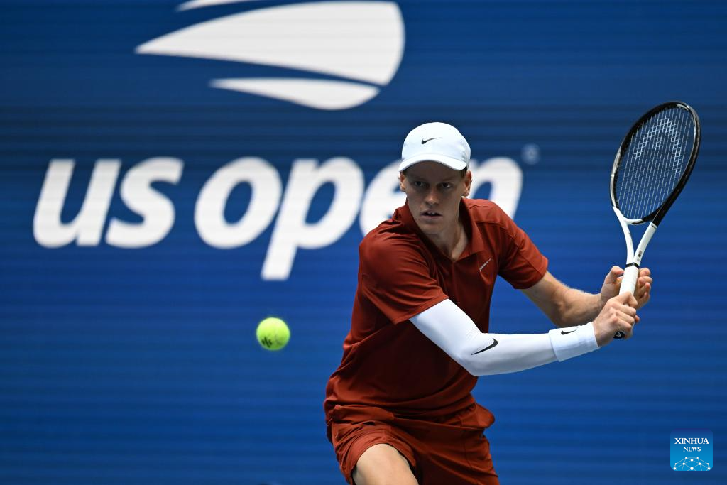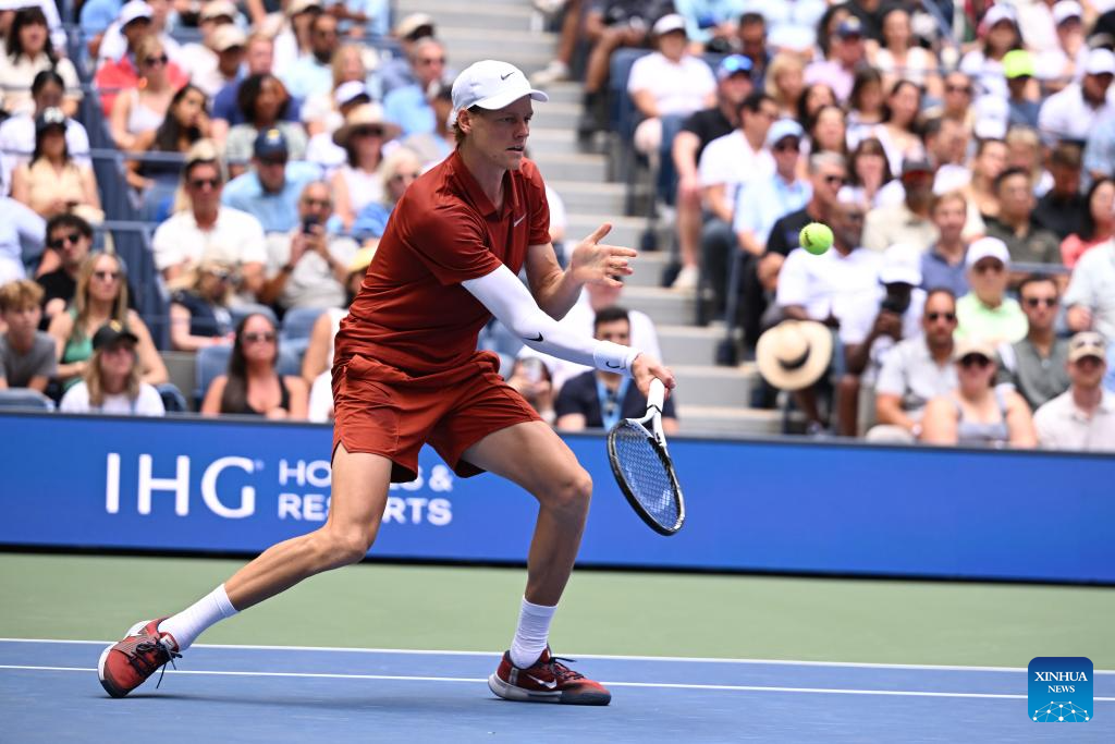 NUEVA YORK, 27 agosto, 2025 (Xinhua) -- Imagen del 26 de agosto de 2025 de Jannik Sinner, de Italia, devolviendo la pelota durante el partido de la primera ronda de individuales masculinos ante Vit Kopriva, de República Checa, en el campeonato de tenis US Open 2025, en Nueva York, Estados Unidos. (Xinhua/Li Rui)